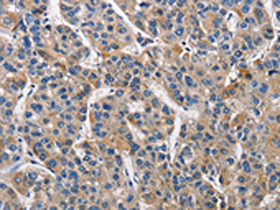 The image on the left is immunohistochemistry of paraffin-embedded Human liver cancer tissue using CSB-PA086611(KLK1 Antibody) at dilution 1/40, on the right is treated with fusion protein. (Original magnification: ×200)