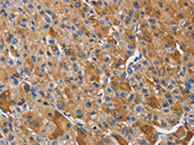 The image on the left is immunohistochemistry of paraffin-embedded Human liver cancer tissue using CSB-PA248038(KLK1 Antibody) at dilution 1/40, on the right is treated with fusion protein. (Original magnification: ×200)