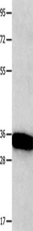 Gel: 10+12%SDS-PAGE, Lysate: 40 μg, Lane: Mouse brain tissue, Primary antibody: CSB-PA175566(KLK5 Antibody) at dilution 1/1600, Secondary antibody: Goat anti rabbit IgG at 1/8000 dilution, Exposure time: 1 minute