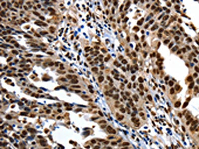 The image on the left is immunohistochemistry of paraffin-embedded Human colon cancer tissue using CSB-PA094965(KLK7 Antibody) at dilution 1/10, on the right is treated with fusion protein. (Original magnification: ×200)