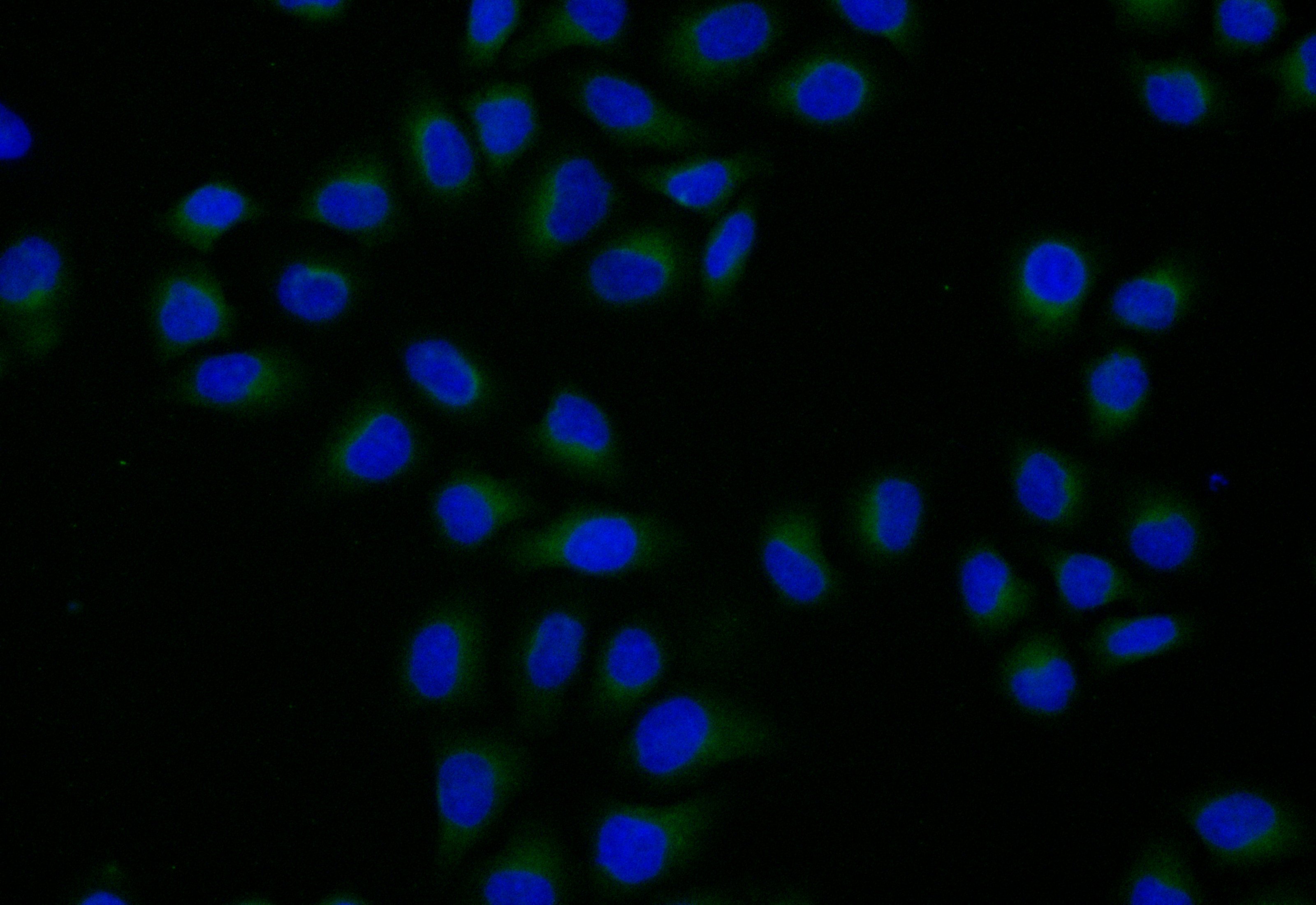 Immunofluorescence staining of A549 cell with CSB-PA012474LA01HU at 1:20, counter-stained with DAPI. The cells were fixed in 4% formaldehyde and blocked in 10% normal Goat Serum. The cells were then incubated with the antibody overnight at 4C. The secondary antibody was Alexa Fluor 488-congugated AffiniPure Goat Anti-Rabbit IgG(H+L).
