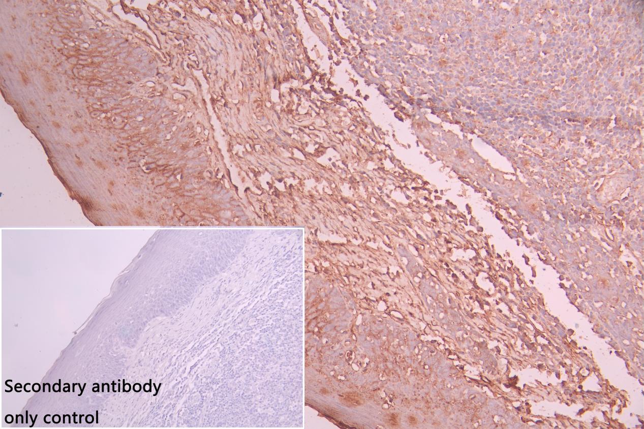 IHC image of CSB-PA012474LA01HU diluted at 1:50 and staining in paraffin-embedded human tonsil tissue performed on a Leica BondTM system. After dewaxing and hydration, antigen retrieval was mediated by high pressure in a citrate buffer (pH 6.0). Section was blocked with 10% normal goat serum 30min at RT. Then primary antibody (1% BSA) was incubated at 4°C overnight. The primary is detected by a Goat anti-rabbit polymer IgG labeled by HRP and visualized using 0.05% DAB. Secondary antibody only control: uses 1% BSA instead of primary antibody