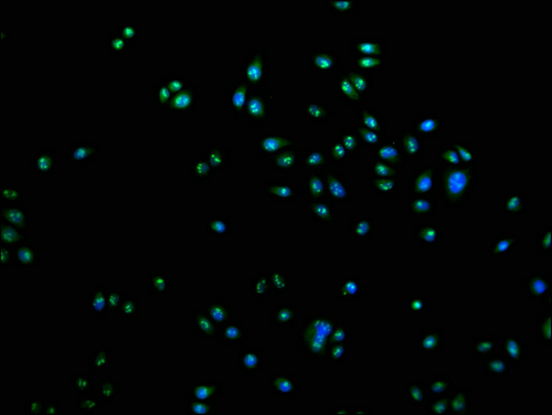 Immunofluorescence staining of Hela cells with CSB-PA769808LA11HU at 1:100, counter-stained with DAPI. The cells were fixed in 4% formaldehyde and blocked in 10% normal Goat Serum. The cells were then incubated with the antibody overnight at 4°C. The secondary antibody was Alexa Fluor 488-congugated AffiniPure Goat Anti-Rabbit IgG(H+L).