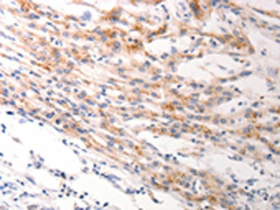 The image on the left is immunohistochemistry of paraffin-embedded Human lung cancer tissue using CSB-PA181038(KRT6A/KRT6B/KRT6C Antibody) at dilution 1/40, on the right is treated with synthetic peptide. (Original magnification: ×200)