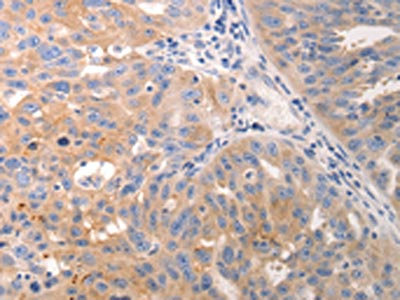 The image on the left is immunohistochemistry of paraffin-embedded Human breast cancer tissue using CSB-PA937892(KRT6A/KRT6B/KRT6C Antibody) at dilution 1/50, on the right is treated with synthetic peptide. (Original magnification: ×200)