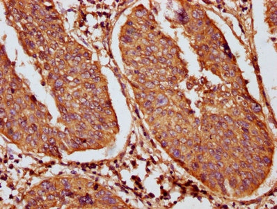 IHC image of CSB-PA012519LA01MO diluted at 1:100 and staining in paraffin-embedded human cervical cancer performed on a Leica BondTM system. After dewaxing and hydration, antigen retrieval was mediated by high pressure in a citrate buffer (pH 6.0). Section was blocked with 10% normal goat serum 30min at RT. Then primary antibody (1% BSA) was incubated at 4°C overnight. The primary is detected by a biotinylated secondary antibody and visualized using an HRP conjugated SP system.