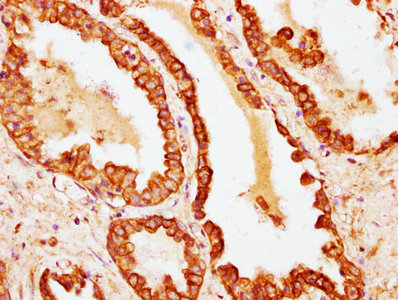 IHC image of CSB-PA012519LA01MO diluted at 1:100 and staining in paraffin-embedded human prostate cancer performed on a Leica BondTM system. After dewaxing and hydration, antigen retrieval was mediated by high pressure in a citrate buffer (pH 6.0). Section was blocked with 10% normal goat serum 30min at RT. Then primary antibody (1% BSA) was incubated at 4°C overnight. The primary is detected by a biotinylated secondary antibody and visualized using an HRP conjugated SP system.