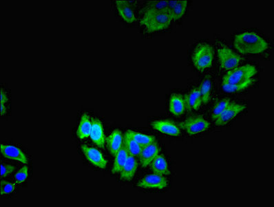 Immunofluorescent analysis of HepG2 cells using CSB-PA012740EA01HU at dilution of 1:100 and Alexa Fluor 488-congugated AffiniPure Goat Anti-Rabbit IgG(H+L)