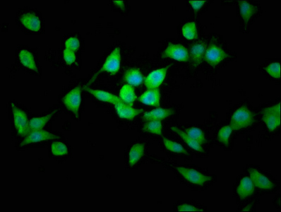 Immunofluorescence staining of SH-SY5Y cells with CSB-PA774814LA01HU at 1:200, counter-stained with DAPI. The cells were fixed in 4% formaldehyde, permeabilized using 0.2% Triton X-100 and blocked in 10% normal Goat Serum. The cells were then incubated with the antibody overnight at 4°C. The secondary antibody was Alexa Fluor 488-congugated AffiniPure Goat Anti-Rabbit IgG(H+L).