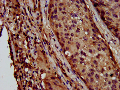 IHC image of CSB-PA774814LA01HU diluted at 1:600 and staining in paraffin-embedded human lung cancer performed on a Leica BondTM system. After dewaxing and hydration, antigen retrieval was mediated by high pressure in a citrate buffer (pH 6.0). Section was blocked with 10% normal goat serum 30min at RT. Then primary antibody (1% BSA) was incubated at 4°C overnight. The primary is detected by a biotinylated secondary antibody and visualized using an HRP conjugated SP system.