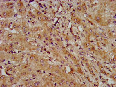 IHC image of CSB-PA774814LA01HU diluted at 1:600 and staining in paraffin-embedded human liver cancer performed on a Leica BondTM system. After dewaxing and hydration, antigen retrieval was mediated by high pressure in a citrate buffer (pH 6.0). Section was blocked with 10% normal goat serum 30min at RT. Then primary antibody (1% BSA) was incubated at 4°C overnight. The primary is detected by a biotinylated secondary antibody and visualized using an HRP conjugated SP system.