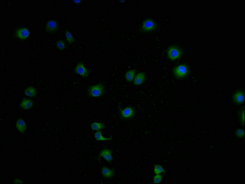 Immunofluorescence staining of A549 cells with CSB-PA012808LA01HU-IF at 1:100, counter-stained with DAPI. The cells were fixed in 4% formaldehyde and blocked in 10% normal Goat Serum. The cells were then incubated with the antibody overnight at 4°C. The secondary antibody was Alexa Fluor 488-congugated AffiniPure Goat Anti-Rabbit IgG(H+L).