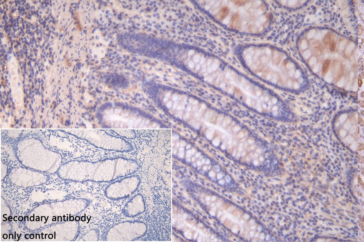 IHC image of CSB-PA012827LA01HU diluted at 1:100 and staining in paraffin-embedded human colorectal cancer performed on a Leica BondTM system. After dewaxing and hydration, antigen retrieval was mediated by high pressure in a citrate buffer (pH 6.0). Section was blocked with 10% normal goat serum 30min at RT. Then primary antibody (1% BSA) was incubated at 4°C overnight. The primary is detected by a Goat anti-rabbit polymer IgG labeled by HRP and visualized using 0.05% DAB. Secondary antibody only control: uses 1% BSA instead of primary antibody