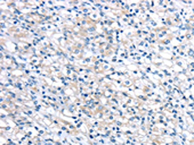 The image on the left is immunohistochemistry of paraffin-embedded Human liver cancer tissue using CSB-PA992989(LEFTY2 Antibody) at dilution 1/20, on the right is treated with fusion protein. (Original magnification: ×200)