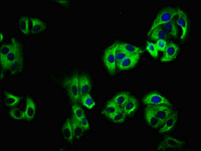Immunofluorescence staining of HepG2 cells with CSB-PA715035LA01HU at 1:100, counter-stained with DAPI. The cells were fixed in 4% formaldehyde, permeabilized using 0.2% Triton X-100 and blocked in 10% normal Goat Serum. The cells were then incubated with the antibody overnight at 4°C. The secondary antibody was Alexa Fluor 488-congugated AffiniPure Goat Anti-Rabbit IgG(H+L).
