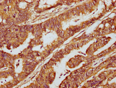 IHC image of CSB-PA715035LA01HU diluted at 1:300 and staining in paraffin-embedded human colon cancer performed on a Leica BondTM system. After dewaxing and hydration, antigen retrieval was mediated by high pressure in a citrate buffer (pH 6.0). Section was blocked with 10% normal goat serum 30min at RT. Then primary antibody (1% BSA) was incubated at 4°C overnight. The primary is detected by a biotinylated secondary antibody and visualized using an HRP conjugated SP system.