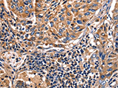 The image on the left is immunohistochemistry of paraffin-embedded Human lung cancer tissue using CSB-PA130656(LGALS8 Antibody) at dilution 1/50, on the right is treated with fusion protein. (Original magnification: ×200)