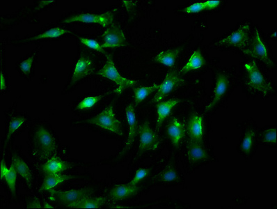 Immunofluorescence staining of NIH/3T3 cells with CSB-PA02649A0Rb at 1:100, counter-stained with DAPI. The cells were fixed in 4% formaldehyde, permeabilized using 0.2% Triton X-100 and blocked in 10% normal Goat Serum. The cells were then incubated with the antibody overnight at 4°C. The secondary antibody was Alexa Fluor 488-congugated AffiniPure Goat Anti-Rabbit IgG(H+L).
