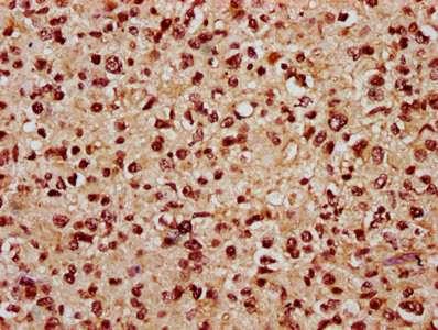 IHC image of CSB-PA716370LA01HU diluted at 1:800 and staining in paraffin-embedded human glioma performed on a Leica BondTM system. After dewaxing and hydration, antigen retrieval was mediated by high pressure in a citrate buffer (pH 6.0). Section was blocked with 10% normal goat serum 30min at RT. Then primary antibody (1% BSA) was incubated at 4°C overnight. The primary is detected by a biotinylated secondary antibody and visualized using an HRP conjugated SP system.