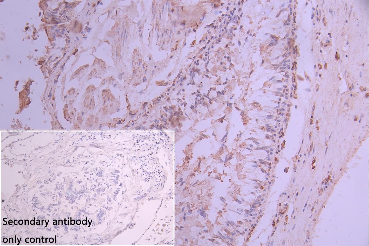 IHC image of CSB-PA012972EA01HU diluted at 1:30 and staining in paraffin-embedded human Lung tissue performed on a Leica BondTM system. After dewaxing and hydration, antigen retrieval was mediated by high pressure in a citrate buffer (pH 6.0). Section was blocked with 10% normal goat serum 30min at RT. Then primary antibody (1% BSA) was incubated at 4°C overnight. The primary is detected by a Goat anti-rabbit polymer IgG labeled by HRP and visualized using 0.05% DAB. Secondary antibody only control: uses 1% BSA instead of primary antibody