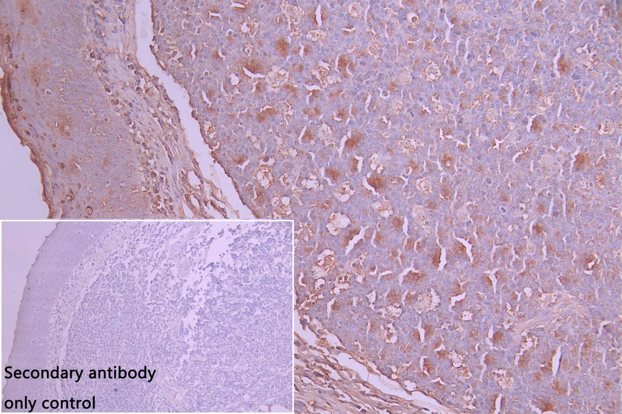 IHC image of CSB-PA012972EA01HU diluted at 1:30 and staining in paraffin-embedded human tonsil tissue performed on a Leica BondTM system. After dewaxing and hydration, antigen retrieval was mediated by high pressure in a citrate buffer (pH 6.0). Section was blocked with 10% normal goat serum 30min at RT. Then primary antibody (1% BSA) was incubated at 4°C overnight. The primary is detected by a Goat anti-rabbit polymer IgG labeled by HRP and visualized using 0.05% DAB. Secondary antibody only control: uses 1% BSA instead of primary antibody
