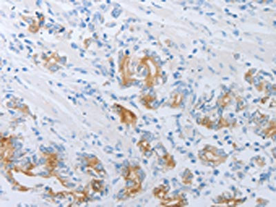 The image on the left is immunohistochemistry of paraffin-embedded Human gastric cancer tissue using CSB-PA130669(LOX Antibody) at dilution 1/30, on the right is treated with synthetic peptide. (Original magnification: ×200)