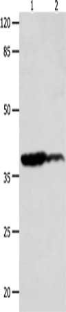 Gel: 10%SDS-PAGE, Lysate: 40 μg, Lane 1-2: Human leiomyosarcoma tissue, Human liver cancer tissue, Primary antibody: CSB-PA037833(LPAR4 Antibody) at dilution 1/450, Secondary antibody: Goat anti rabbit IgG at 1/8000 dilution, Exposure time: 30 seconds