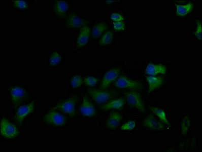 Immunofluorescence staining of Hela cells with CSB-PA013051OA01HU at 1:50, counter-stained with DAPI. The cells were fixed in 4% formaldehyde, permeabilized using 0.2% Triton X-100 and blocked in 10% normal Goat Serum. The cells were then incubated with the antibody overnight at 4°C. The secondary antibody was Alexa Fluor 488-congugated AffiniPure Goat Anti-Rabbit IgG(H+L).