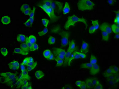 Immunofluorescence staining of MCF-7 cells with CSB-PA009078LA01HU at 1:200, counter-stained with DAPI. The cells were fixed in 4% formaldehyde, permeabilized using 0.2% Triton X-100 and blocked in 10% normal Goat Serum. The cells were then incubated with the antibody overnight at 4°C. The secondary antibody was Alexa Fluor 488-congugated AffiniPure Goat Anti-Rabbit IgG(H+L).
