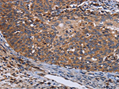 The image on the left is immunohistochemistry of paraffin-embedded Human cervical cancer tissue using CSB-PA206609(LRRC15 Antibody) at dilution 1/60, on the right is treated with fusion protein. (Original magnification: ×200)