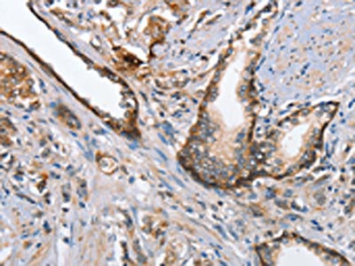 The image on the left is immunohistochemistry of paraffin-embedded Human prostate cancer tissue using CSB-PA246770(MAD2L1BP Antibody) at dilution 1/65, on the right is treated with fusion protein. (Original magnification: ×200)