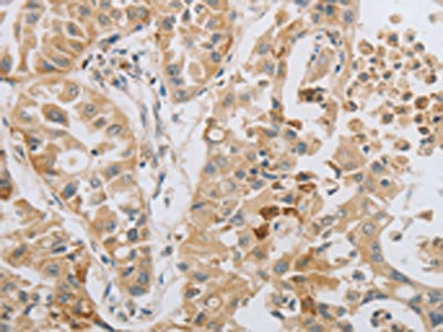 The image on the left is immunohistochemistry of paraffin-embedded Human lung cancer tissue using CSB-PA083281(MAGEB4 Antibody) at dilution 1/50, on the right is treated with fusion protein. (Original magnification: ×200)