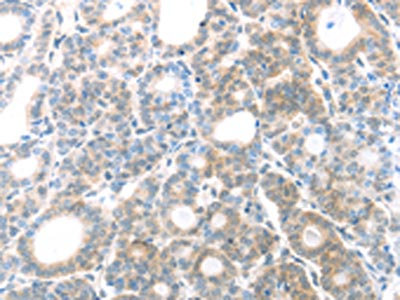 The image on the left is immunohistochemistry of paraffin-embedded Human thyroid cancer tissue using CSB-PA145666(MAGED1 Antibody) at dilution 1/30, on the right is treated with fusion protein. (Original magnification: ×200)