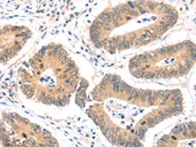 The image on the left is immunohistochemistry of paraffin-embedded Human colon cancer tissue using CSB-PA145666(MAGED1 Antibody) at dilution 1/30, on the right is treated with fusion protein. (Original magnification: ×200)