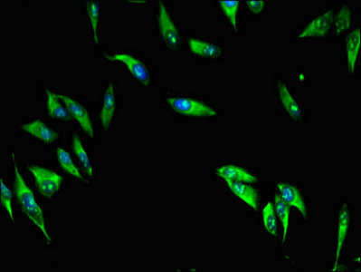 Immunofluorescent analysis of Hela cells using CSB-PA879069LA01HU at dilution of 1:100 and Alexa Fluor 488-congugated AffiniPure Goat Anti-Rabbit IgG(H+L)
