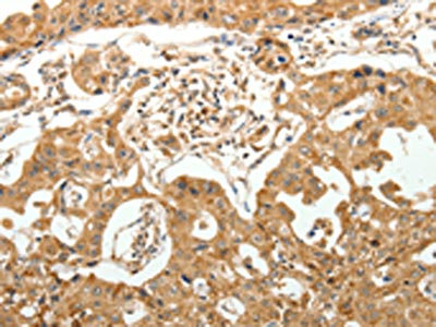 The image on the left is immunohistochemistry of paraffin-embedded Human lung cancer tissue using CSB-PA218026(MAP1B Antibody) at dilution 1/40, on the right is treated with synthetic peptide. (Original magnification: ×200)