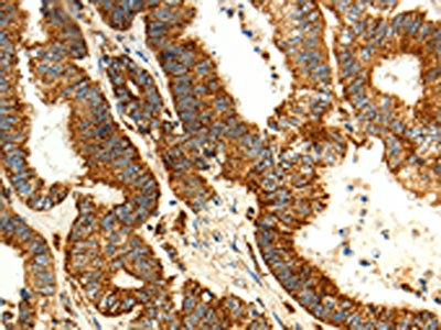 The image on the left is immunohistochemistry of paraffin-embedded Human colon cancer tissue using CSB-PA578056(MAP1LC3A Antibody) at dilution 1/15, on the right is treated with fusion protein. (Original magnification: ×200)