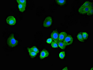 Immunofluorescent analysis of HepG2 cells using CSB-PA887153LA01HU at dilution of 1:100 and Alexa Fluor 488-congugated AffiniPure Goat Anti-Rabbit IgG(H+L)