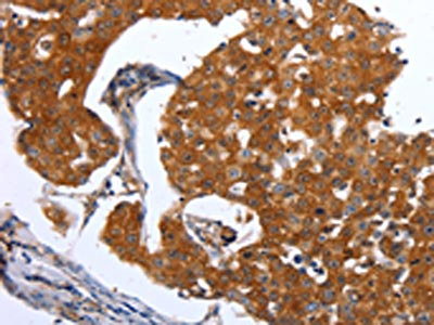 The image on the left is immunohistochemistry of paraffin-embedded Human ovarian cancer tissue using CSB-PA439945(MAP2K1 Antibody) at dilution 1/25, on the right is treated with synthetic peptide. (Original magnification: ×200)