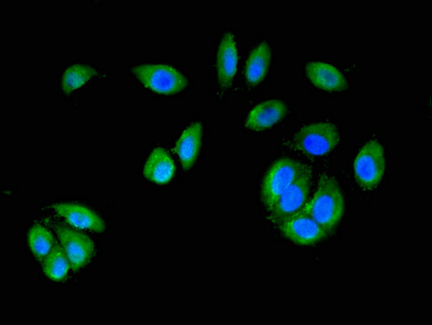 Immunofluorescence staining of A549 cells with CSB-PA013415LA01HU at 1:200, counter-stained with DAPI. The cells were fixed in 4% formaldehyde, permeabilized using 0.2% Triton X-100 and blocked in 10% normal Goat Serum. The cells were then incubated with the antibody overnight at 4°C. The secondary antibody was Alexa Fluor 488-congugated AffiniPure Goat Anti-Rabbit IgG(H+L).