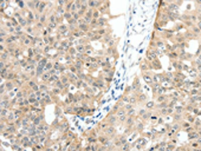 The image on the left is immunohistochemistry of paraffin-embedded Human ovarian cancer tissue using CSB-PA091701(MAP3K14 Antibody) at dilution 1/30, on the right is treated with fusion protein. (Original magnification: ×200)