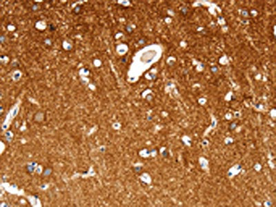 The image on the left is immunohistochemistry of paraffin-embedded Human brain tissue using CSB-PA570132(MAP4K1 Antibody) at dilution 1/30, on the right is treated with synthetic peptide. (Original magnification: ×200)