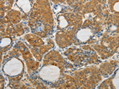 The image on the left is immunohistochemistry of paraffin-embedded Human thyroid cancer tissue using CSB-PA286198(MAP4K5 Antibody) at dilution 1/10, on the right is treated with fusion protein. (Original magnification: ×200)