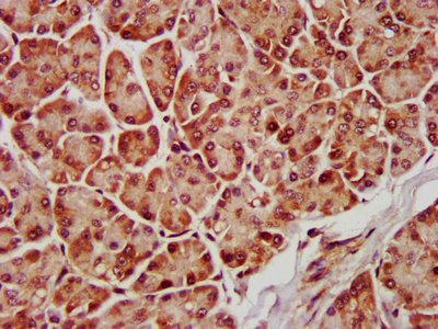 IHC image of CSB-PA013448LA01HU diluted at 1:600 and staining in paraffin-embedded human pancreatic tissue performed on a Leica BondTM system. After dewaxing and hydration, antigen retrieval was mediated by high pressure in a citrate buffer (pH 6.0). Section was blocked with 10% normal goat serum 30min at RT. Then primary antibody (1% BSA) was incubated at 4°C overnight. The primary is detected by a biotinylated secondary antibody and visualized using an HRP conjugated SP system.