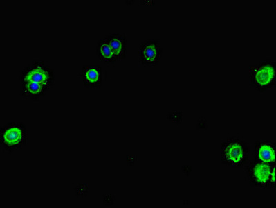 Immunofluorescent analysis of HepG2 cells using CSB-PA013448LA01HU at dilution of 1: 100 and Alexa Fluor 488-congugated AffiniPure Goat Anti-Rabbit IgG(H+L)