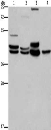 Gel: 8%SDS-PAGE,Lysate: 40 μg,Lane 1-4: 293T cells, Human brain malignant glioma tissue, Mouse brain tissue, Human hepatocellsular carcinoma tissue,Primary antibody: CSB-PA152806(MAPK1/MAPK3 Antibody) at dilution 1/550 dilution,Secondary antibody: Goat anti rabbit IgG at 1/8000 dilution,Exposure time: 20 seconds