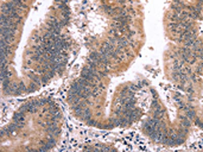 The image on the left is immunohistochemistry of paraffin-embedded Human colon cancer tissue using CSB-PA299002(MAPK13 Antibody) at dilution 1/15, on the right is treated with synthetic peptide. (Original magnification: ×200)