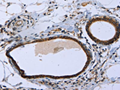 The image on the left is immunohistochemistry of paraffin-embedded Human breast cancer tissue using CSB-PA059696(MAPRE3 Antibody) at dilution 1/20, on the right is treated with fusion protein. (Original magnification: ×200)