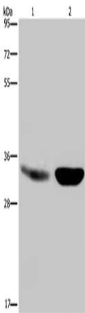 Gel: 8%SDS-PAGE, Lysate: 40 μg, Lane 1-2: Human fetal brain tissue, mouse brain tissue, Primary antibody: CSB-PA059696(MAPRE3 Antibody) at dilution 1/500, Secondary antibody: Goat anti rabbit IgG at 1/8000 dilution, Exposure time: 5 seconds