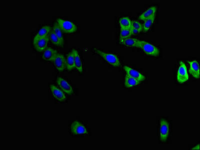 Immunofluorescent analysis of HepG2 cells using CSB-PA11169A0Rb at dilution of 1:100 and Alexa Fluor 488-congugated AffiniPure Goat Anti-Rabbit IgG(H+L)